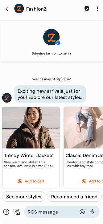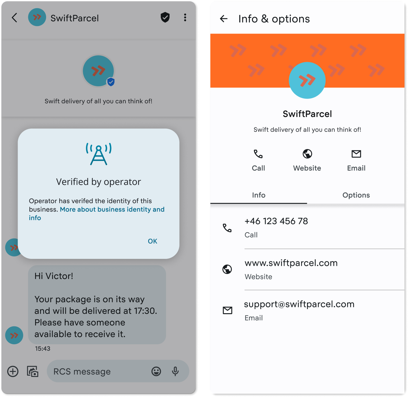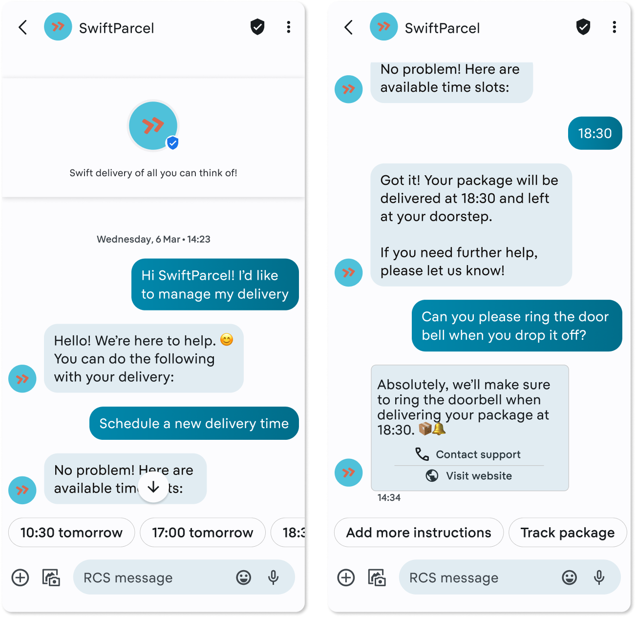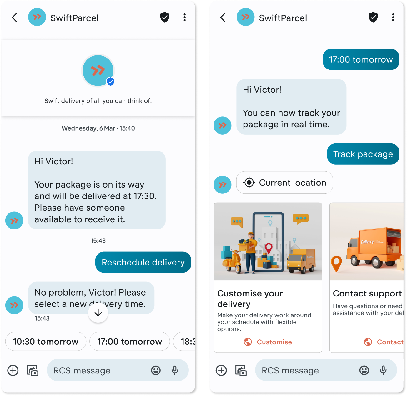 RCS für Business Messaging (RBM) hebt Ihre Kundenkommunikation auf die nächste Stufe. Es bietet ein markenbezogenes, vertrauenswürdiges Format, das es Kunden erleichtert, Maßnahmen zu ergreifen – sei es ein Kauf, die Inanspruchnahme von Support oder die Buchung einer Dienstleistung. Mit integrierten Sicherheitsfunktionen, verifizierten Absendern und modernen Features bietet RCS einen Kommunikationskanal, der sowohl ansprechend ist als auch einen echten geschäftlichen Mehrwert bietet.