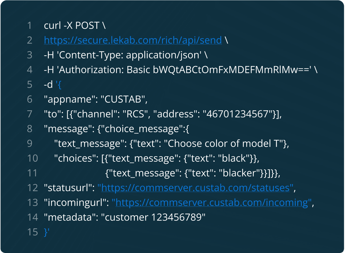 Integrieren Sie unsere robusten und flexiblen RCS-APIs und beginnen Sie mit dem Versenden von Rich Messages. Sehen Sie sich die vollständige API-Dokumentation und Code-Beispiele an. Unser Support-Team steht Ihnen jederzeit zur Verfügung.