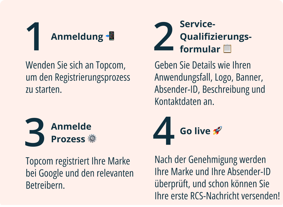 Der Wechsel von SMS zu RCS ist ganz einfach. Registrieren Sie Ihre Kontakt- und Branding-Daten. Wählen Sie die Arten von Nachrichten aus, die Sie versenden möchten, sei es Werbung, OTP, Transaktionen (z. B. Bestellinformationen) oder Mehrfachnutzung (eine Kombination oder Konversationsnachrichten) in der Sprache Ihrer Wahl.