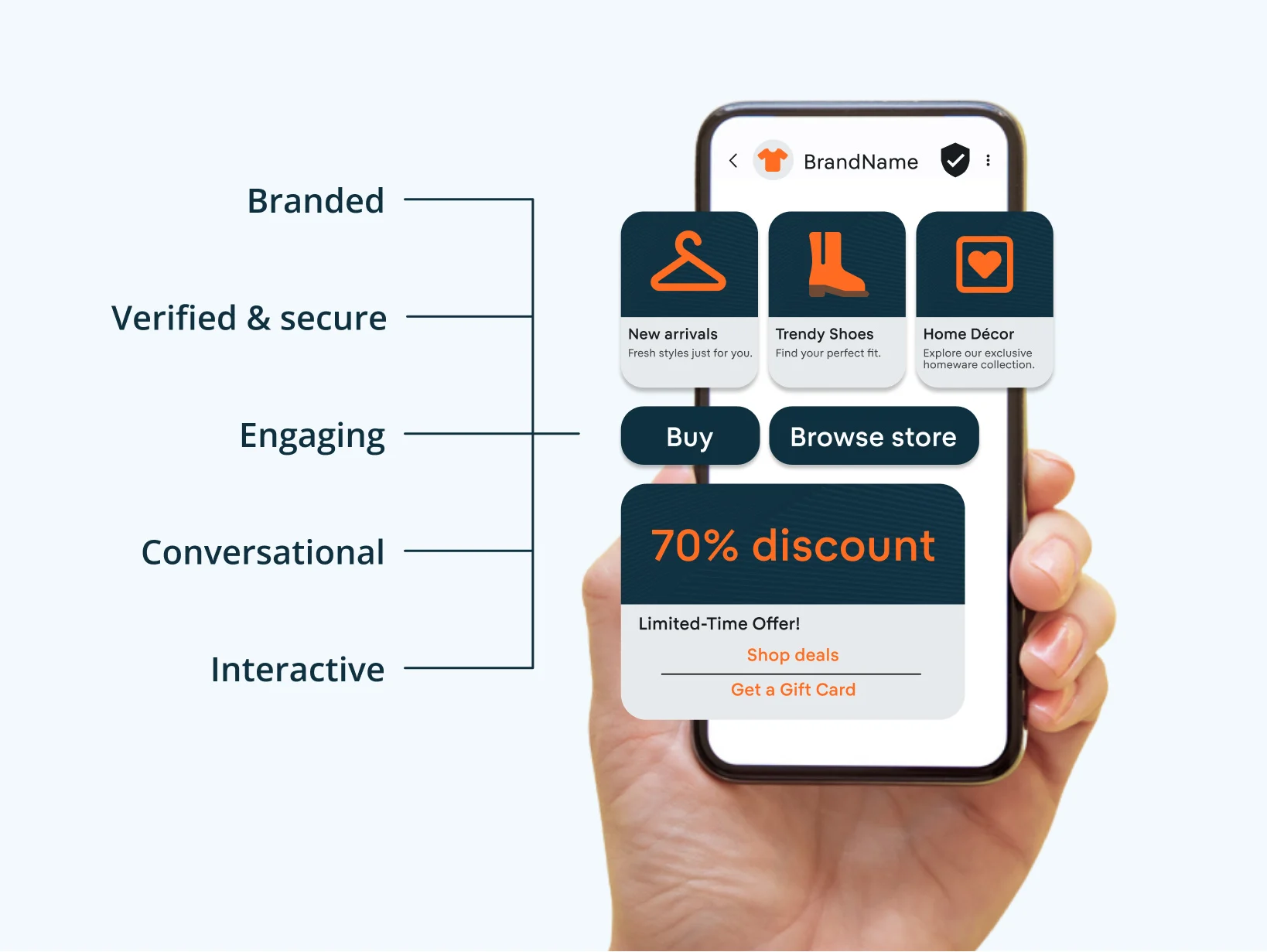 Entdecken Sie Karussells, vorgeschlagene Aktionen und Antworten, Rich Cards, Rich Link-Vorschauen, Standortfreigabe in Echtzeit und vieles mehr, um Aufmerksamkeit zu erregen und das Engagement zu steigern.